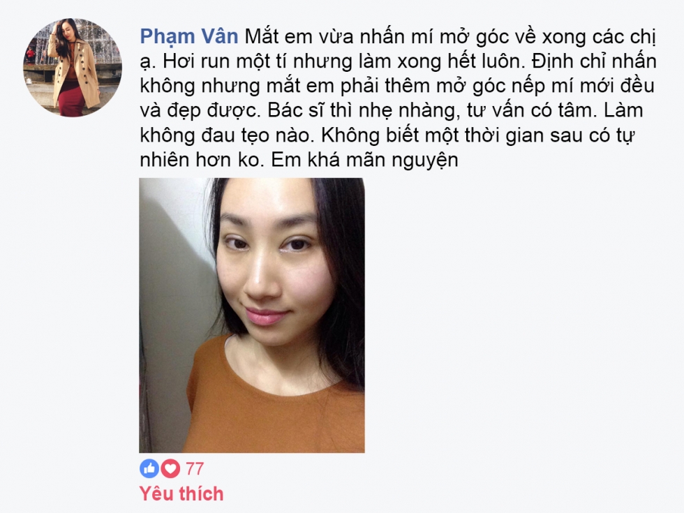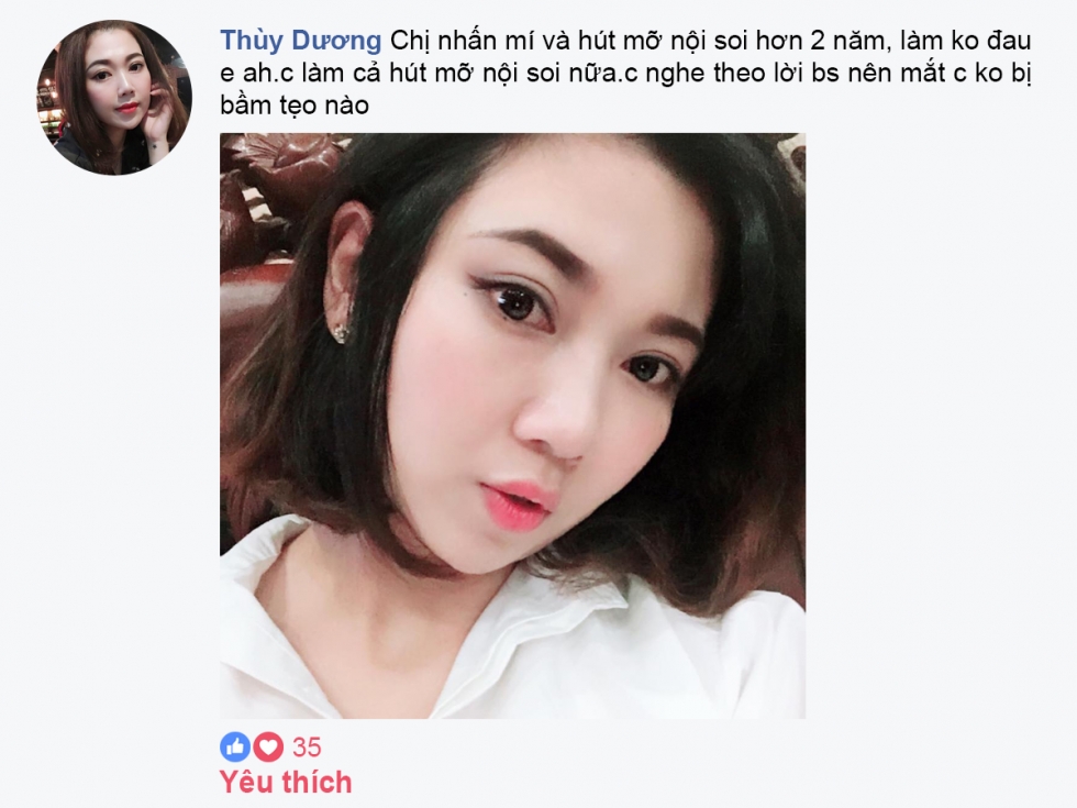 “Bác sĩ làm nhanh lắm, mình thì không nhìn thấy gì lúc đó nhưng cứ cảm thấy bác sĩ làm thoăn thoắt ấy thôi. Tí cái là đã xong rồi mà cũng không thấy đau đớn gì cả nha. Mình nghĩ bác sĩ nào càng lành nghề, làm càng nhanh thì mình càng ít đau. Cứ tưởng tưởng bây giờ một chỗ đau của mình bị day đi day lại sẽ đau hơn rất nhiều so với một phát xong luôn đúng không…” Đó là chia sẻ rất dễ thương của một chị khách hàng tới cắt mí và hút mỡ mắt khi “tư vấn” cho những khách hàng khác.
