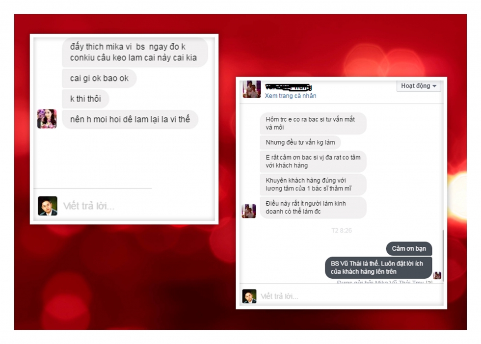 Nếu bạn để ý hay tìm hiểu sẽ thấy rất ít hình ảnh của khách hàng đã làm đẹp trong hơn 10 năm qua xuất hiện trên website, facebook hay quảng cáo của TMV. Đơn giản, nguyên tắc của Mika Vũ Thái luôn tôn trọng ý kiến của khách hàng, nếu bạn không đồng ý, bất kì 1 thông tin nào, dù là nhỏ nhất của bạn cũng sẽ không được đưa ra bên ngoài.