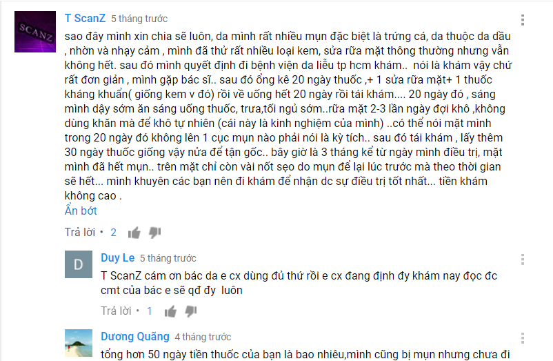 “sau đây mình xin chia sẽ luôn, da mình rất nhiều mụn đặc biệt là trứng cá, da thuộc da dầu , nhờn và nhạy cảm , mình đã thử rất nhiều loại kem, sửa rữa mặt thông thường nhưng vẫn không hết. sau đó mình quyết định đi bệnh viện da liễu tp hcm khám.. nói là khám vậy chứ rất đơn giản , mình gặp bác sĩ.. sau đó ổng kê 20 ngày thuốc ,+ 1 sửa rữa mặt+ 1 thuốc kháng khuẩn( giống kem v đó) rồi về uống hết 20 ngày rồi tái khám.... 20 ngày đó , sáng mình dậy sớm ăn sáng uống thuốc, trưa,tối ngủ sớm..rữa mặt 2-3 lần ngày đợi khô ,không dùng khăn mà để khô tự nhiên (cái này là kinh nghiệm của mình) ..có thể nói mặt mình trong 20 ngày đó không lên 1 cục mụn nào phải nói là kỳ tích.. sau đó tái khám , lấy thêm 30 ngày thuốc giống vậy nửa để tận gốc.. bây giờ là 3 tháng kể từ ngày mình điều trị, mặt mình đã hết mụn.. trên mặt chỉ còn vài nốt sẹo do mụn để lại lúc trước mà theo thời gian sẽ hết... mình khuyên các bạn nên đi khám để nhận dc sự điều trị tốt nhất... tiền khám không cao “