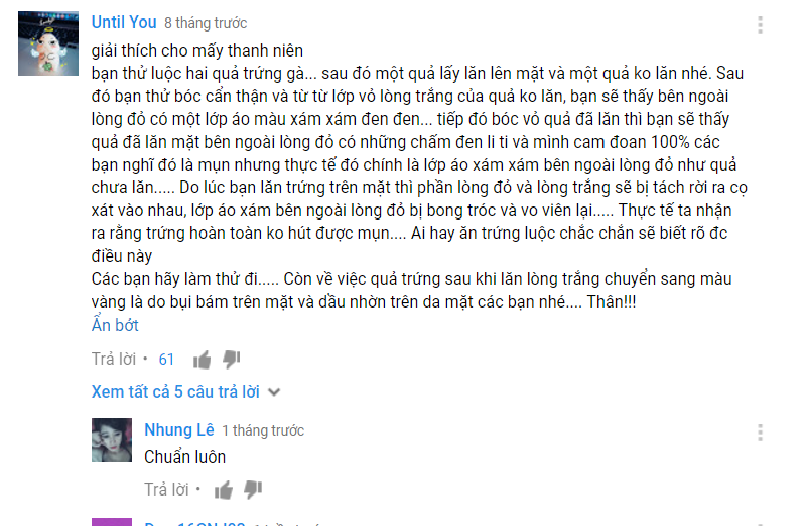 “Giải thích cho mấy thanh niên bạn thử luộc hai quả trứng gà... sau đó một quả lấy lăn lên mặt và một quả ko lăn nhé. Sau đó bạn thử bóc cẩn thận và từ từ lớp vỏ lòng trắng của quả ko lăn, bạn sẽ thấy bên ngoài lòng đỏ có một lớp áo màu xám xám đen đen... tiếp đó bóc vỏ quả đã lăn thì bạn sẽ thấy quả đã lăn mặt bên ngoài lòng đỏ có những chấm đen li ti và mình cam đoan 100% các bạn nghĩ đó là mụn nhưng thực tế đó chính là lớp áo xám xám bên ngoài lòng đỏ như quả chưa lăn..... Do lúc bạn lăn trứng trên mặt thì phần lòng đỏ và lòng trắng sẽ bị tách rời ra cọ xát vào nhau, lớp áo xám bên ngoài lòng đỏ bị bong tróc và vo viên lại..... Thực tế ta nhận ra rằng trứng hoàn toàn ko hút được mụn.... Ai hay ăn trứng luộc chắc chắn sẽ biết rõ đc điều này Các bạn hãy làm thử đi..... Còn về việc quả trứng sau khi lăn lòng trắng chuyển sang màu vàng là do bụi bám trên mặt và dầu nhờn trên da mặt các bạn nhé.... Thân!!!”