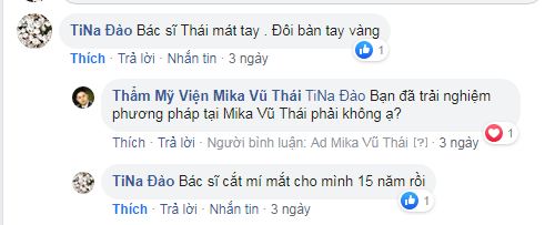Bạn Tina Đào sau 15 năm thực hiện phương pháp cắt mí mắt tại Mika Vũ Thái có bày tỏ: “Bác sĩ Vũ Thái cắt mí mắt cho mình 15 năm rồi…Bác sĩ Thái mát tay. Đôi bàn tay vàng”. Chị thực sự hài lòng với kết quả đôi mắt sau cắt mí của mình cho tới hiện tại.