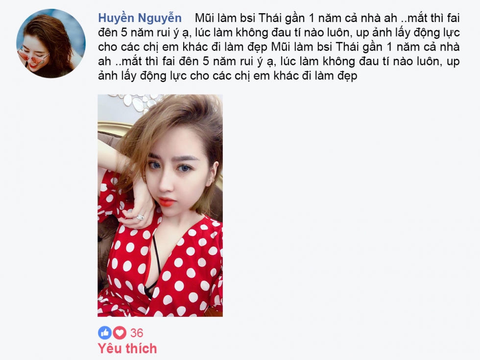 Huyền Nguyễn: “Mũi làm bác sĩ Thái gần 1 năm cả nhà ah…mắt thì phải đến 5 năm rùi ý ạ, lúc làm không đau tí nào luôn, up ảnh lấy động lự cho các chị em khác đi làm đẹp…”
