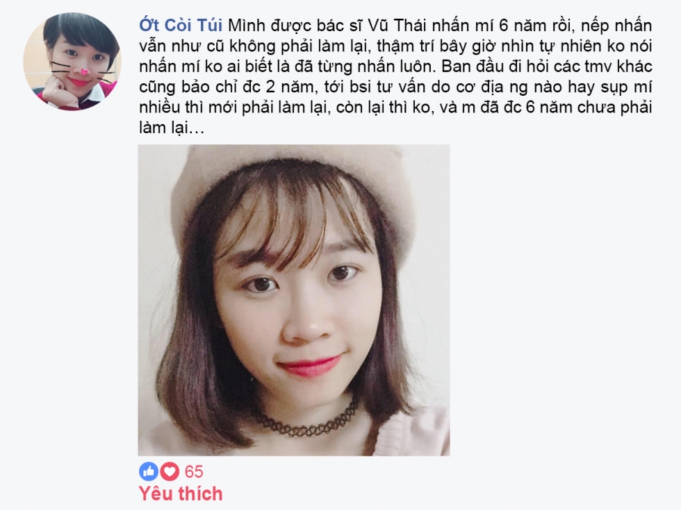 Ớt Còi Túi: “Mình được bác sĩ Vũ Thái nhấn mí 6 năm rồi, nếp nhấn vẫn như cũ không phải làm lại, thậm chí bây giờ nhìn tự nhiên không nói nhấn mí không ai biết là đã từng nhấn luôn. Ban đầu đi hỏi các TMV khác cũng bảo chỉ được 2 năm, tới bác sĩ tư vấn do cơ địa người nào hay sụp mí nhiều thì mới phải làm lại còn lại thì không và mình đã được 6 năm chưa phải làm lại…”