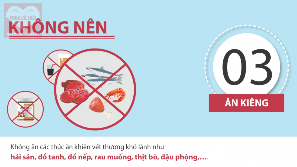 +Không ăn các thức ăn khiến vết thương khó lành như hải sản, đồ tanh, đồ nếp, rau muống, thịt bò, đậu phộng,….