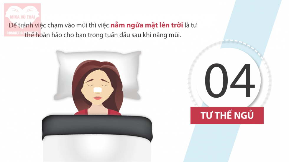 Dù khó khăn nhưng hãy cố gắng nằm như thế này trong ít nhất 3-4 ngày đầu để bảo vệ cho sự liên kết giữa vật liệu nâng mũi và mũi. Sau khi cắt chỉ thì bạn có thể bắt đầu nằm nghiêng được nhưng vẫn nên ưu tiên tư thế nằm thẳng. Sau khoảng 1 tháng thì mũi đã vững chắc vào vào form, có thể nằm thẳng hoặc nằm nghiêng thoải mái, đừng nằm sấp là được.