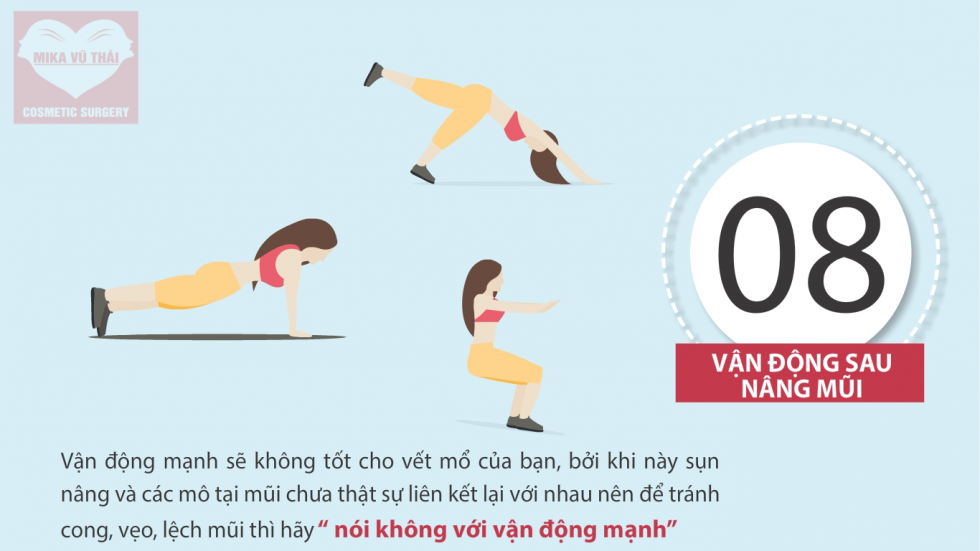 Nếu là một người yêu vận động và thể dục thể thao, bạn cũng nên dừng lại ít nhất 3-6 tuần sau khi nâng mũi. Nếu muốn đi bộ, đạp xe hay tập yoga nhẹ nhàng thì cũng nên hỏi ý kiến của bác sĩ trước đề phòng những biến chứng không may xảy ra.