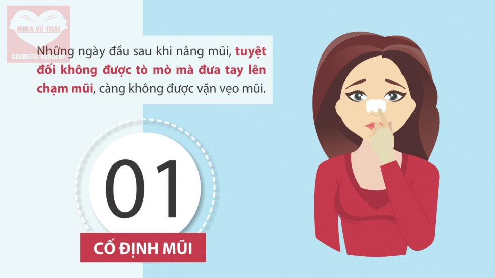 Những ngày đầu sau khi nâng mũi, tuyệt đối không được tò mò mà đưa tay lên chạm mũi, càng không được vặn vẹo mũi. Việc đi đứng, sinh hoạt lúc này phải vô cùng cẩn trọng, không được để chiếc mũi bị va vào đâu, đặc biệt là những vật cứng, nhọn.